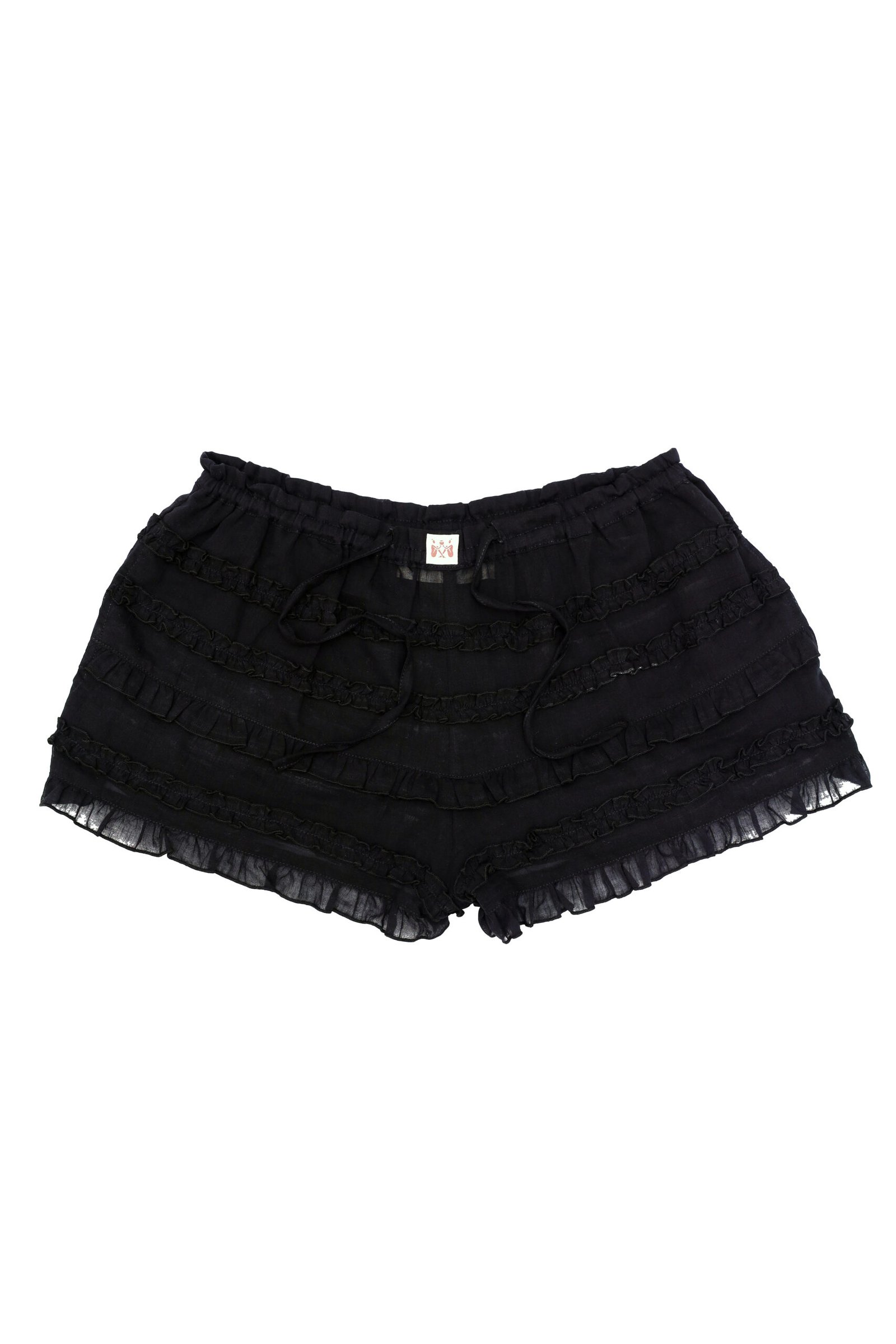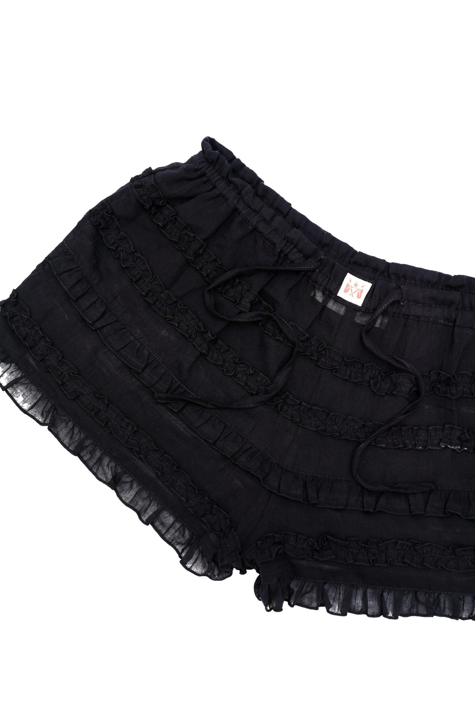 These lightweight shorts are crafted in a coral pink tie-dye fabric, designed with a series of horizontal ruffle tiers that add playful volume and texture. The waistband is fully elasticated for comfort and ease of wear. These shorts are ideal for lounging, beach days, or casual summer outings, offering both comfort and a fun, girly look.
