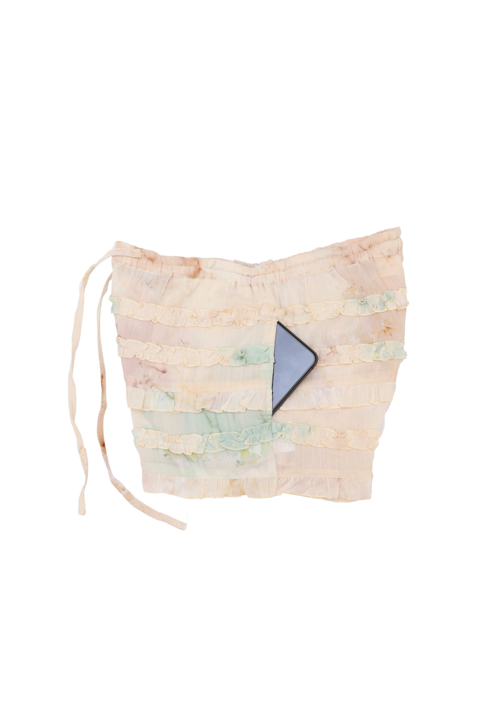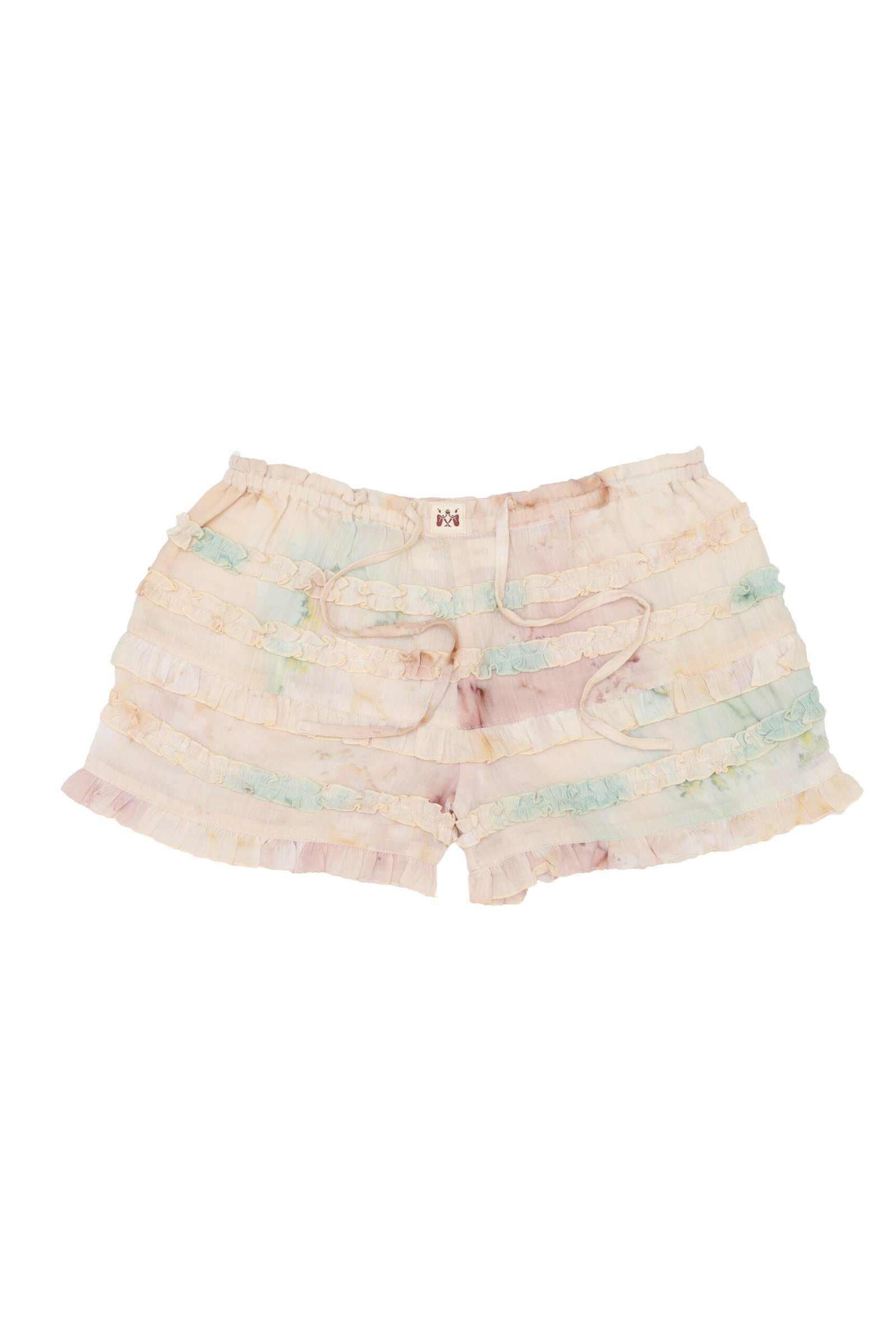 These lightweight shorts are crafted in a coral pink tie-dye fabric, designed with a series of horizontal ruffle tiers that add playful volume and texture. The waistband is fully elasticated for comfort and ease of wear. These shorts are ideal for lounging, beach days, or casual summer outings, offering both comfort and a fun, girly look.