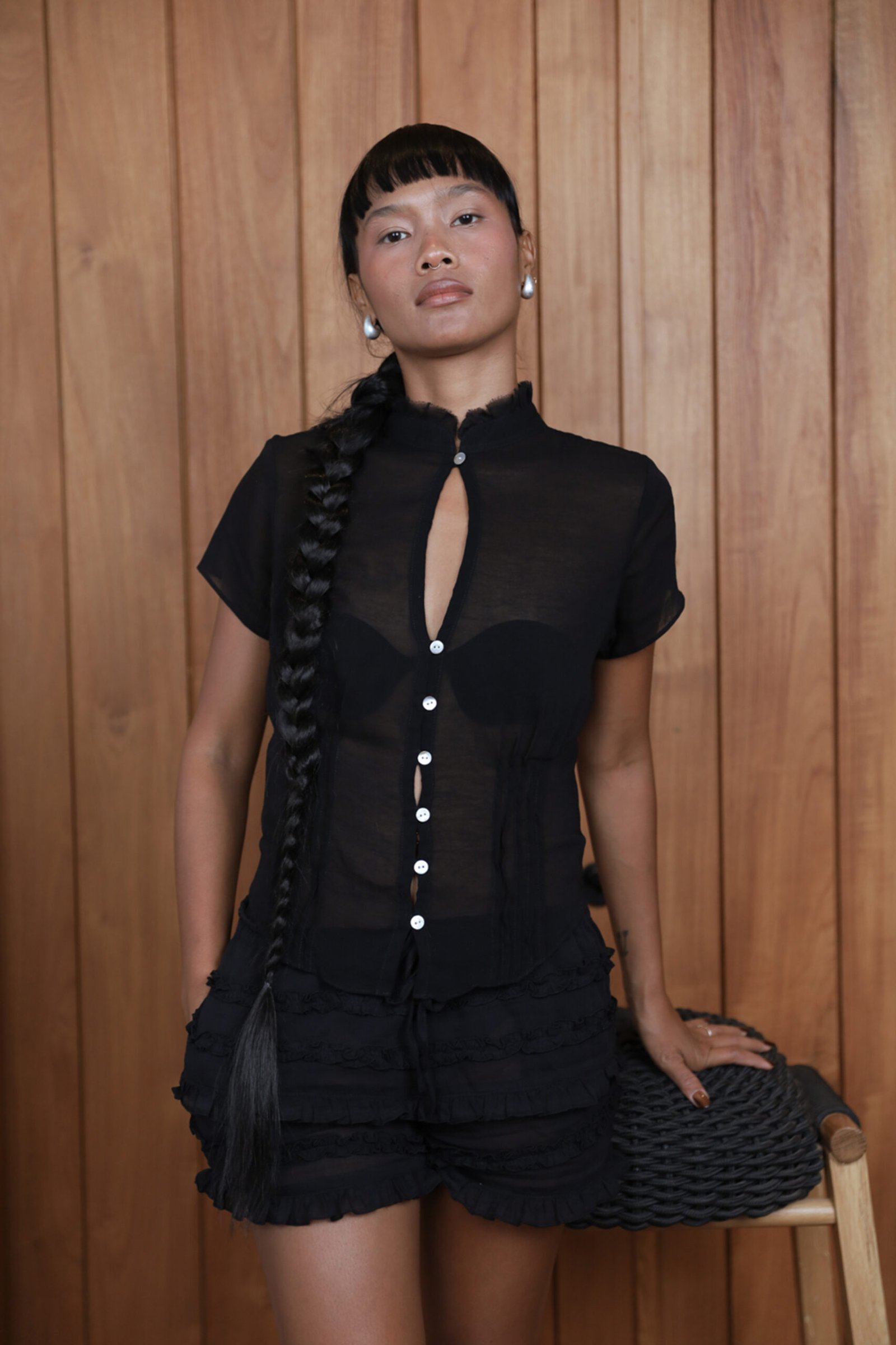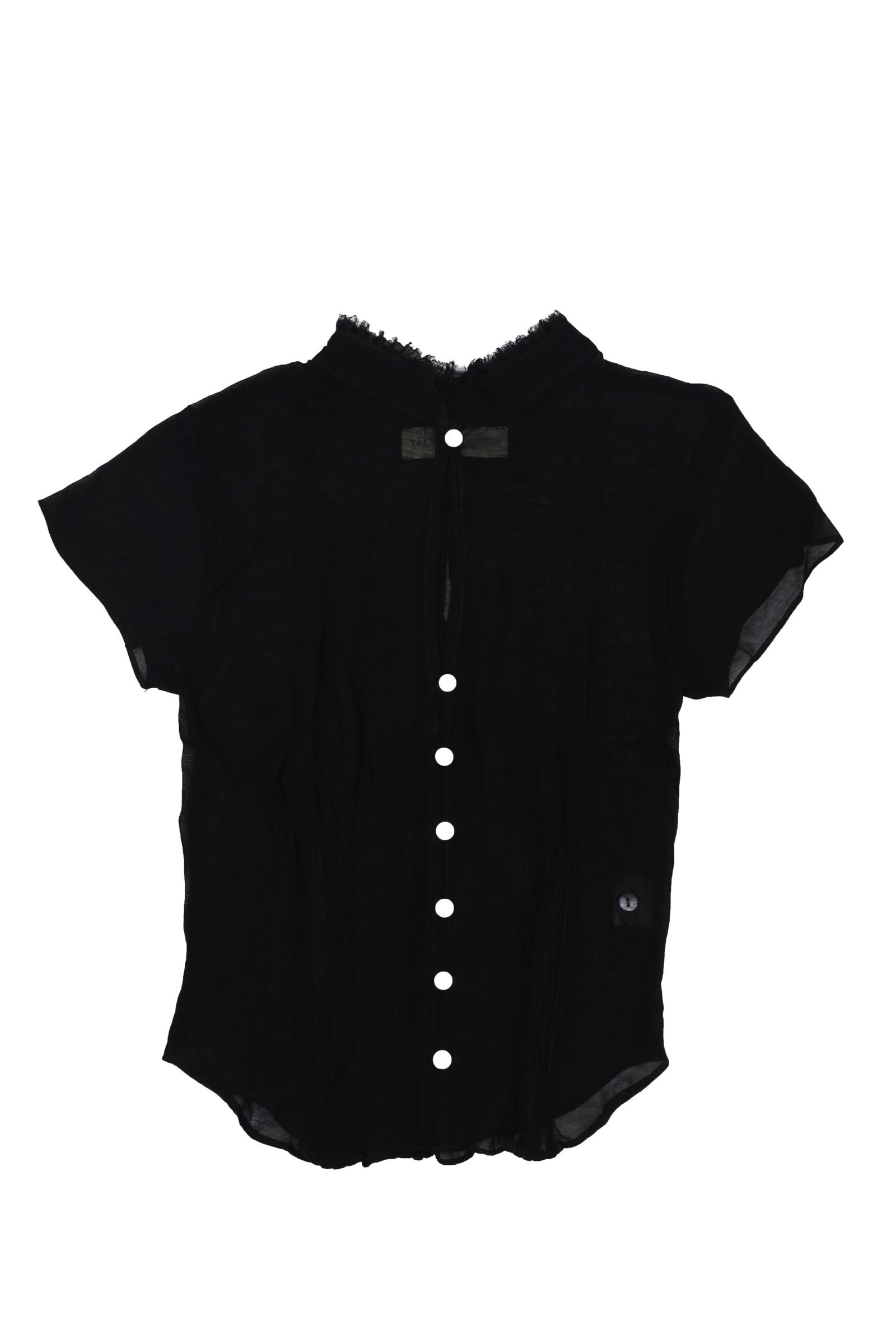 Women’s top made from soft, drapey viscose fabric. Designed with a ruffled neckline, short sleeves, and a row of front buttons for a sweet and elegant look. Available in pastel and black tie-dye motifs that create a feminine and unique impression, perfect for casual or semi-formal everyday wear.