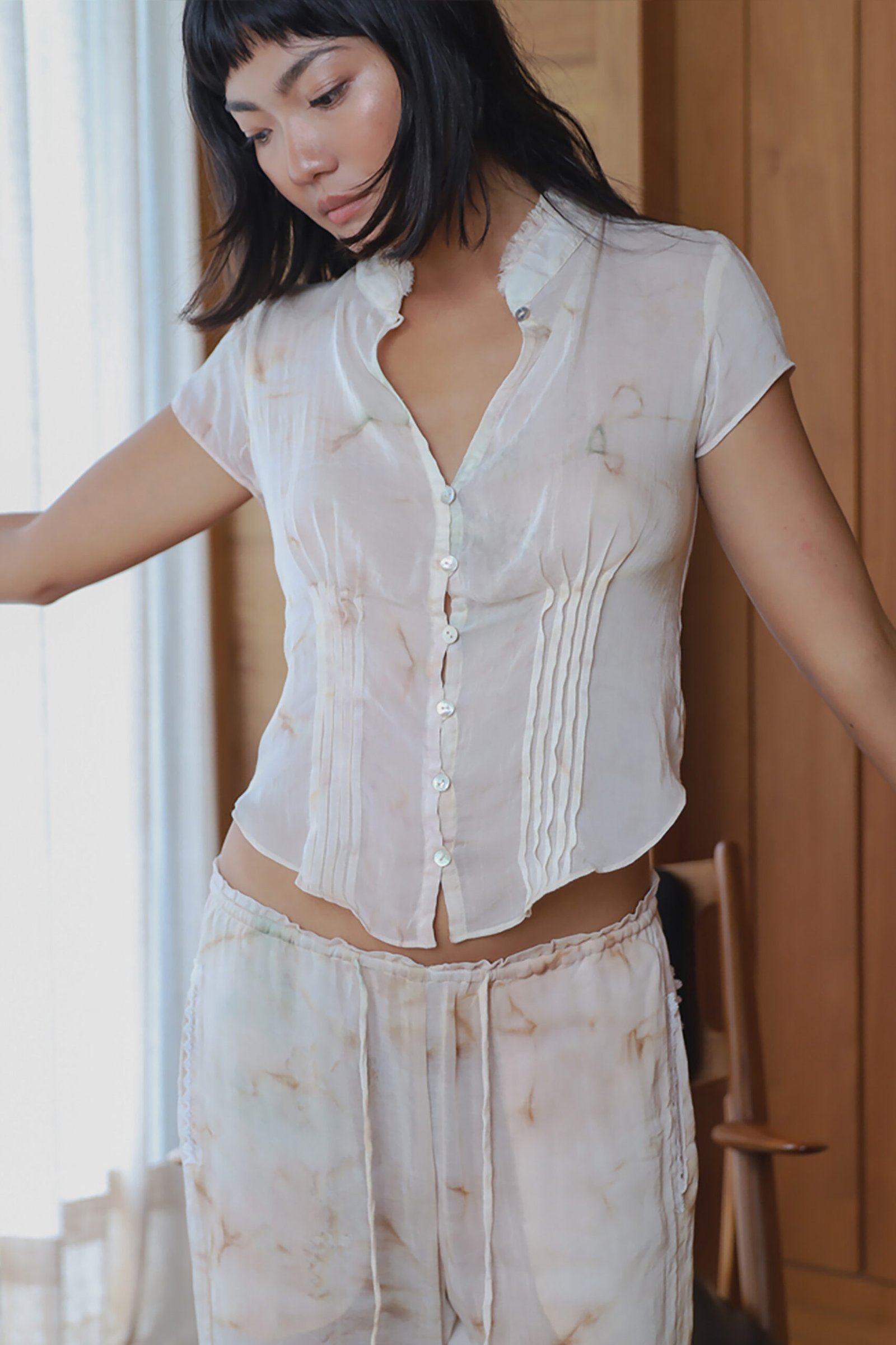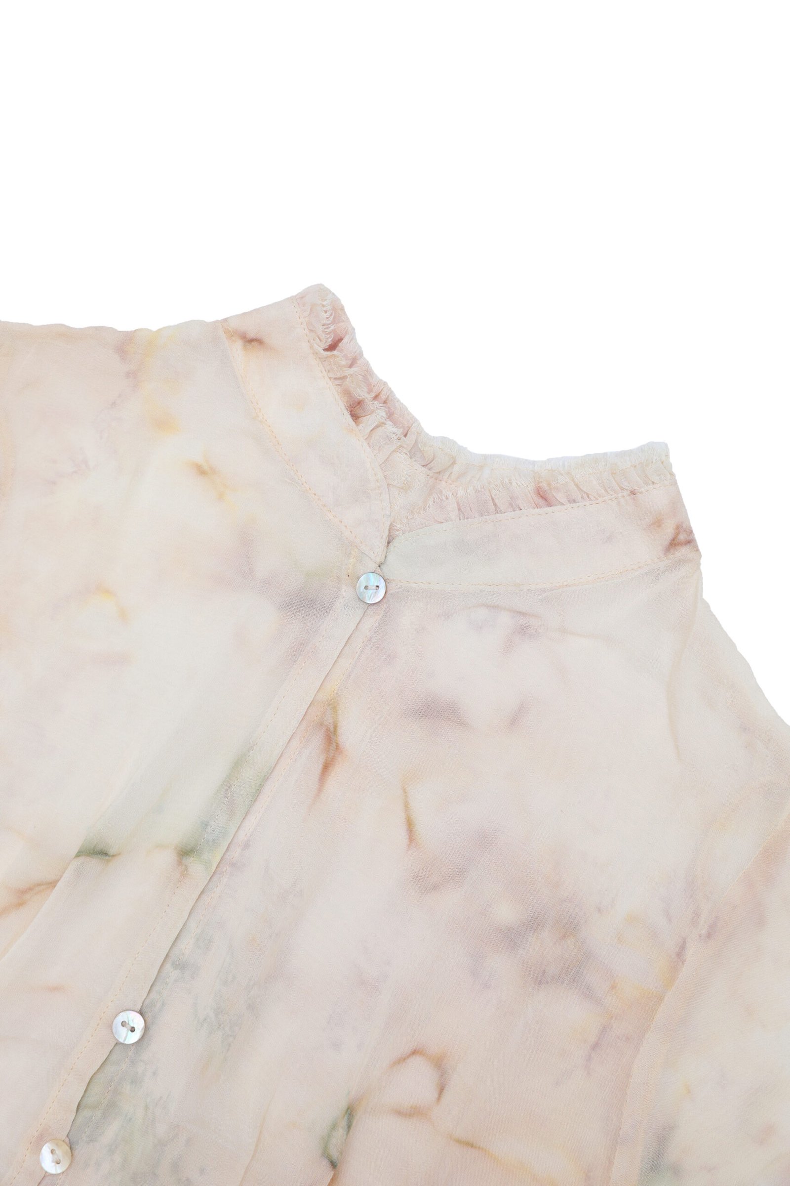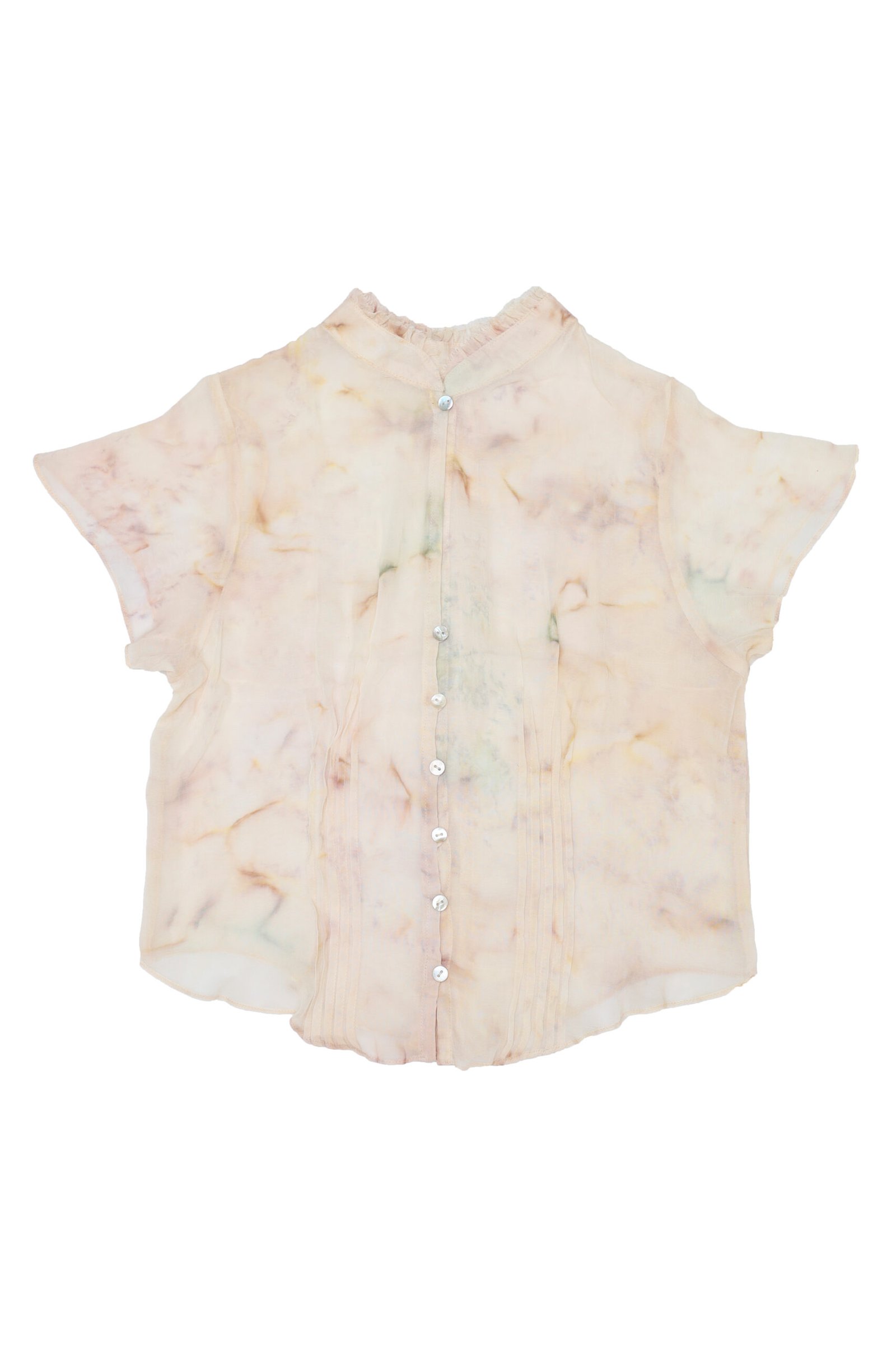 Women’s top made from soft, drapey viscose fabric. Designed with a ruffled neckline, short sleeves, and a row of front buttons for a sweet and elegant look. Available in pastel and black tie-dye motifs that create a feminine and unique impression, perfect for casual or semi-formal everyday wear.