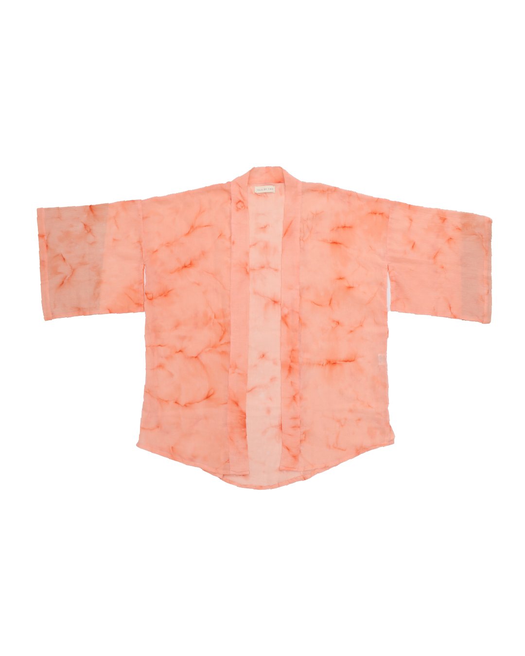 A lightweight, comfortable kimono made from cotton crepe fabric. Designed with a soft peach tie-dye pattern, this piece offers a relaxed yet stylish look. Features include mid-length sleeves, a front tie closure, and an adjustable waist belt for a flattering fit. Perfect as a casual outer layer or an everyday statement piece.