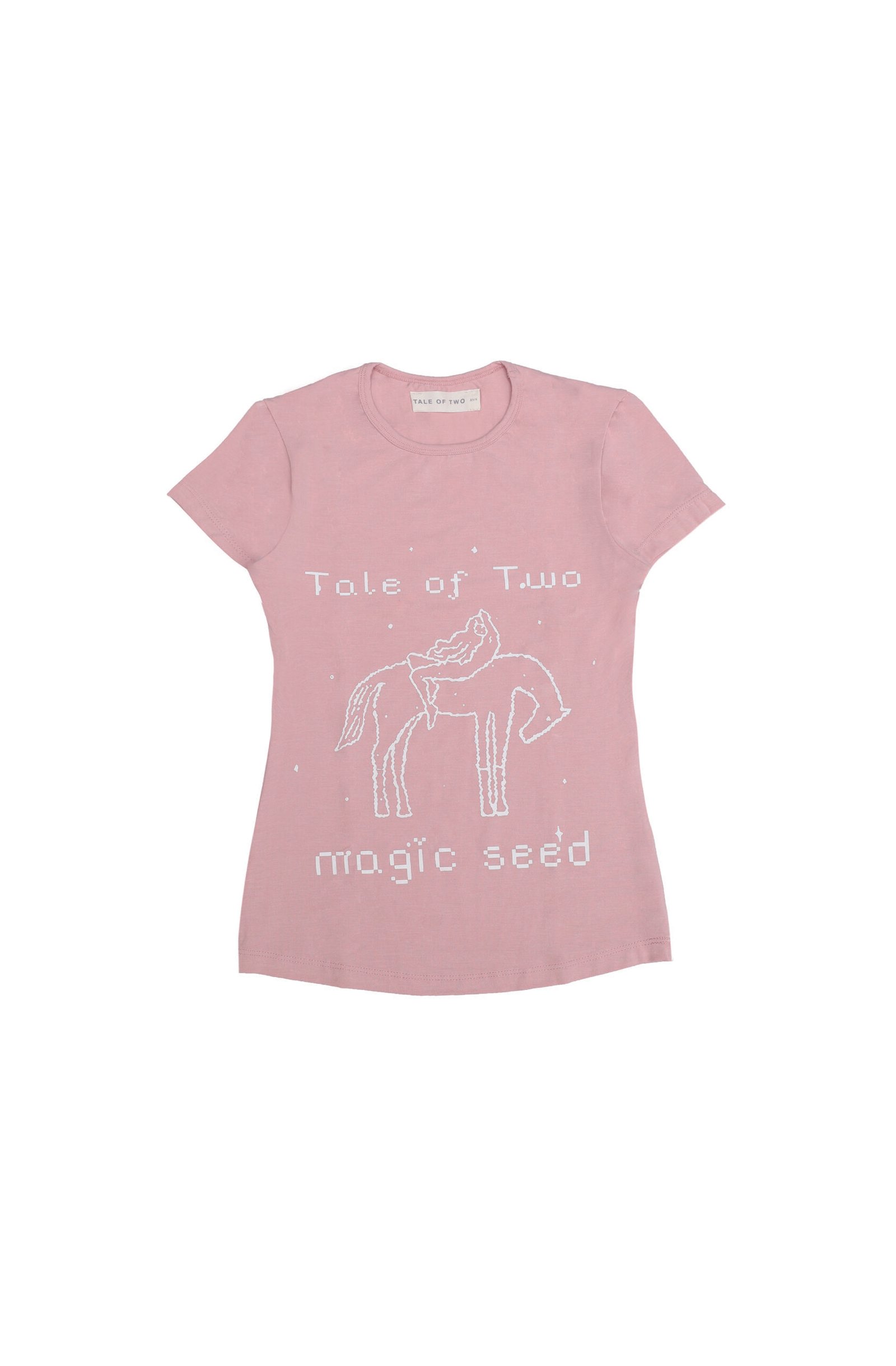 A T-shirt with a simple, clean silhouette. It features a minimalist line illustration of a woman sitting casually on a horse, surrounded by small star-like dots. The words “Tale of Two” at the top and “magic seed” at the bottom are written in a pixel-style font, adding a retro and dreamy touch. The overall vibe feels calm, slightly mysterious, and artsy — a blend of minimal monochrome aesthetics with a soft fantasy feel. Perfect for a casual look that remains unique and subtly statement-making.