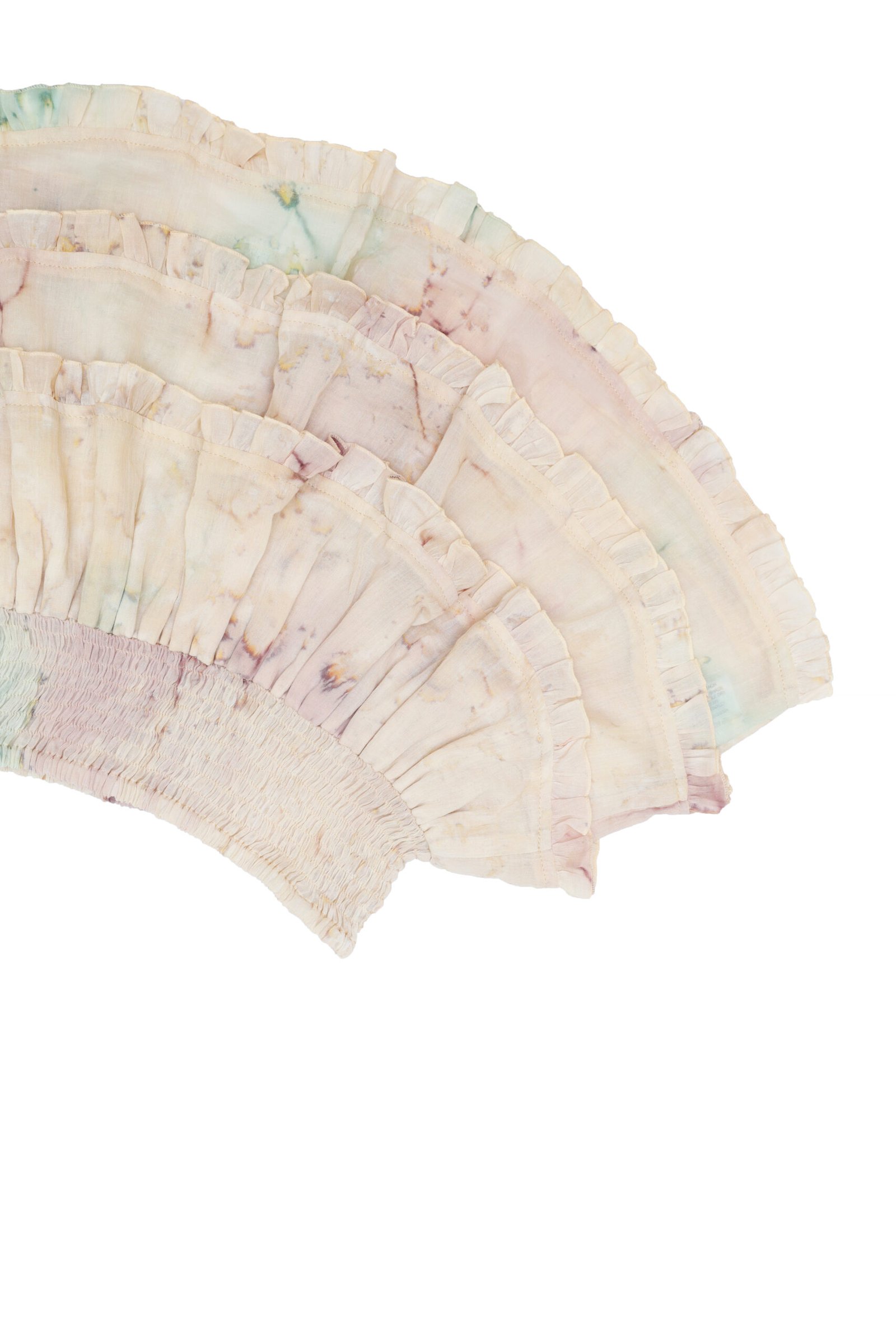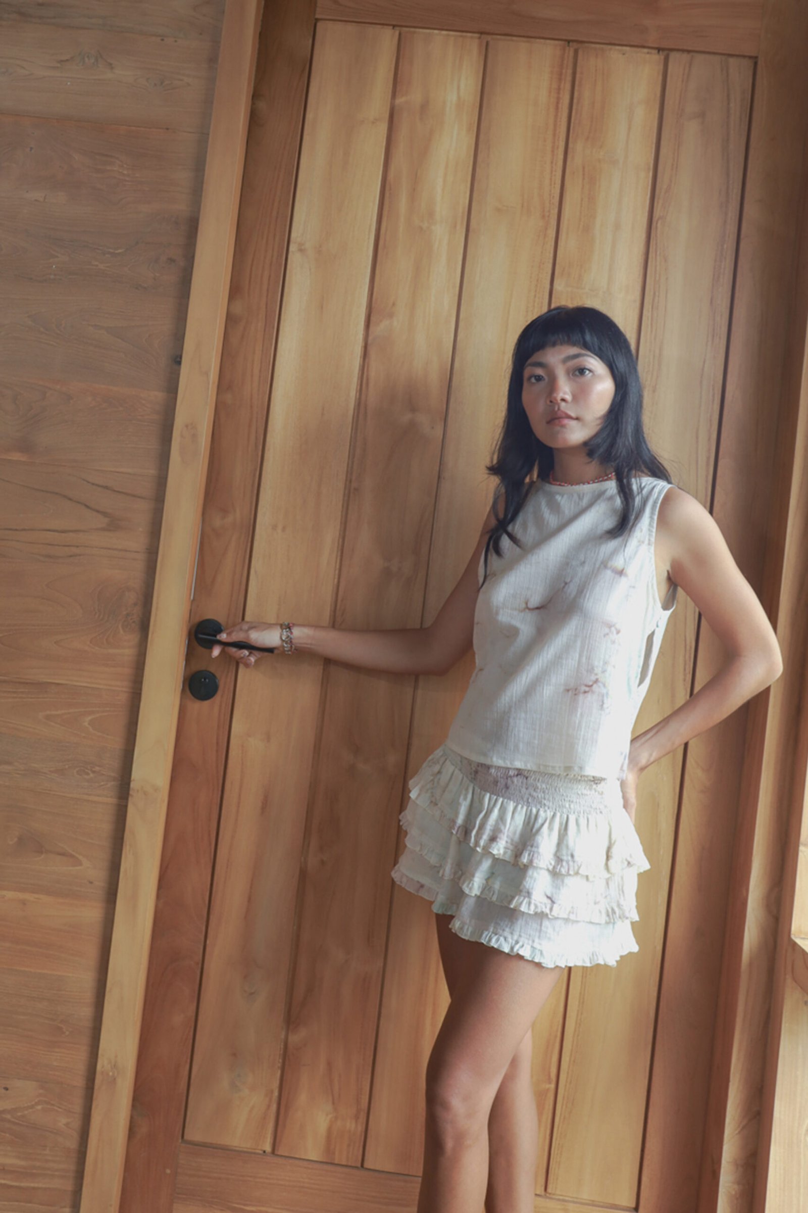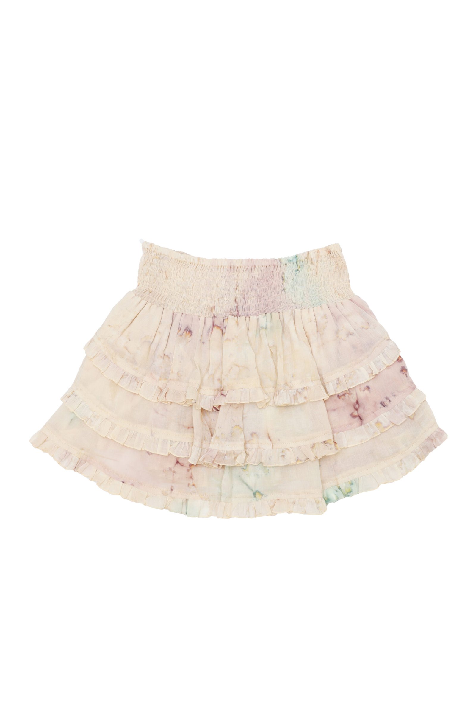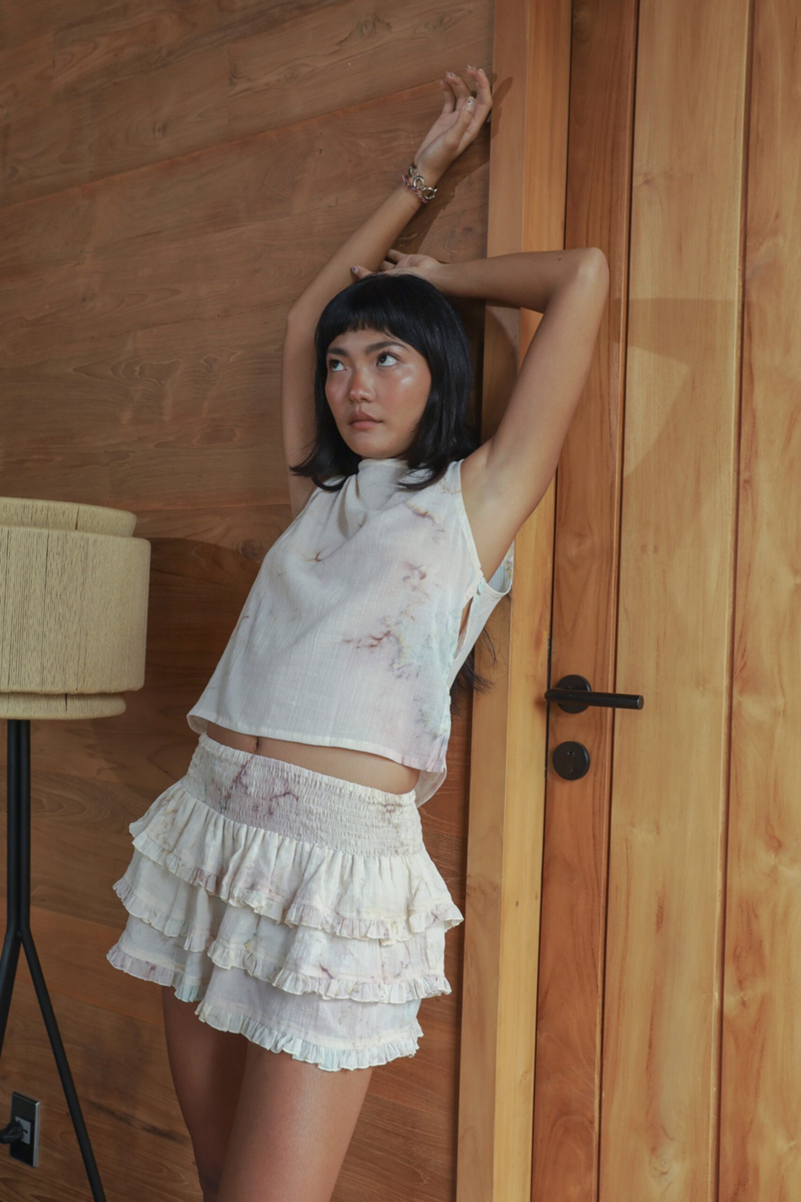 A short layered skirt made of soft cotton in our marigold tie dye. It’s designed with three small ruffle tiers that add volume and a girly touch. The smocked elastic waistband offers a flexible and comfortable fit.