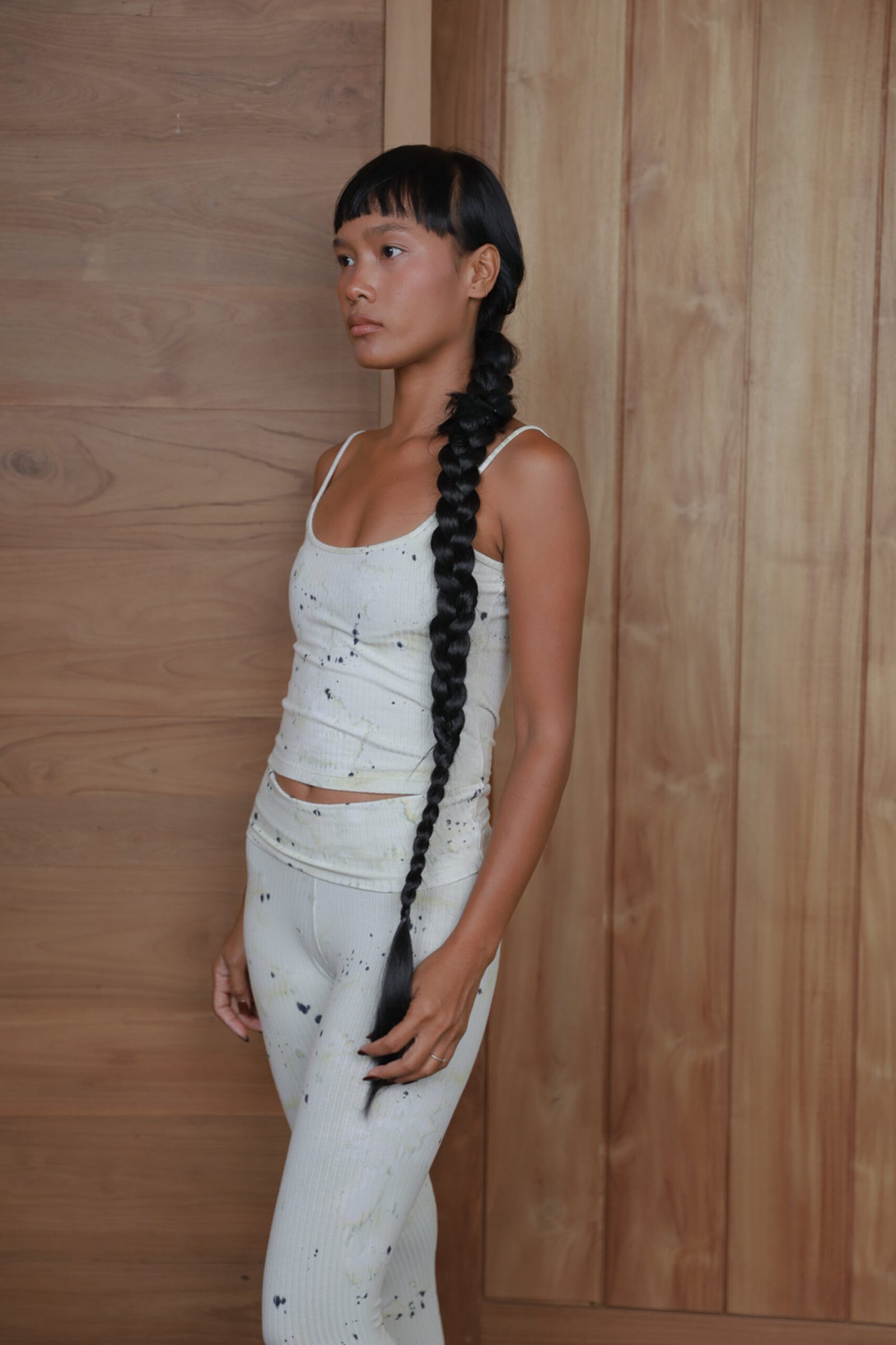 This tank top is designed with an elegant, slim-fitting silhouette that naturally enhances the body’s contours. Featuring delicate spaghetti straps and a clean scoop neckline, it creates a modern and feminine look. Crafted from soft, stretchy, and breathable ribbed fabric, it offers optimal comfort while maintaining a polished structure. The abstract t-dye motif on a soft-toned base adds an exclusive artistic character. Perfect for refined everyday wear or sophisticated layering.