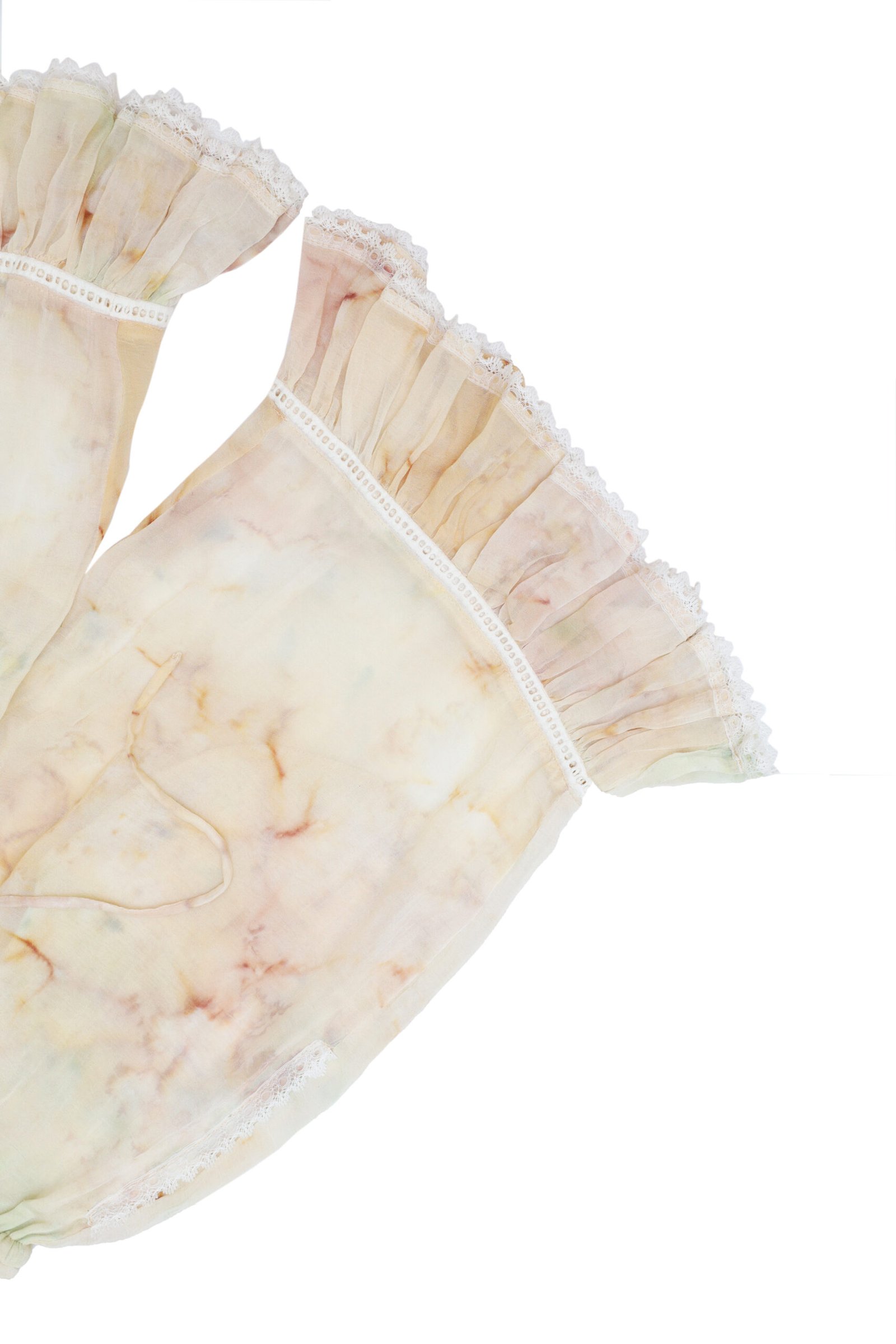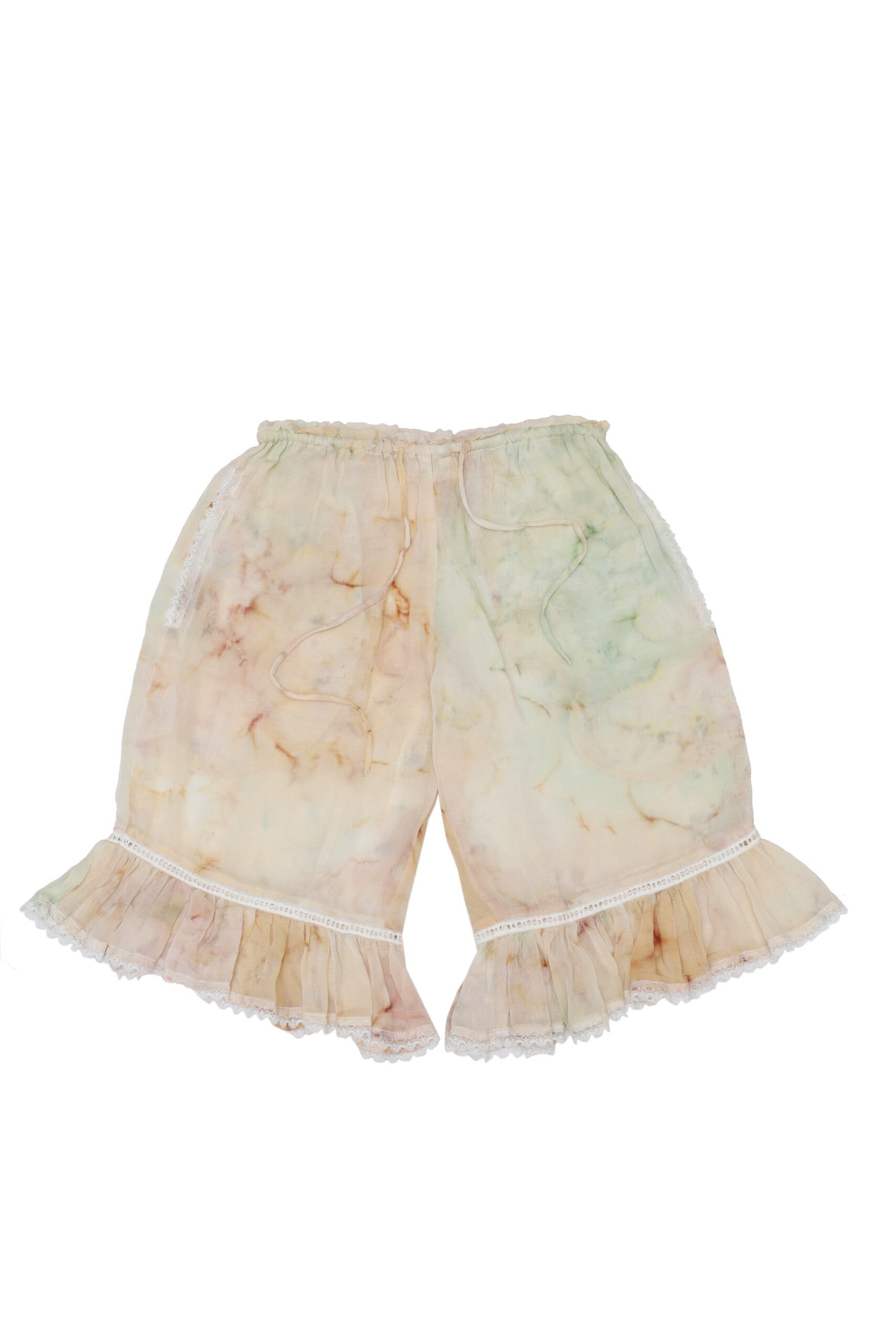 Pants made in our Rose tie-dye pattern in soft pastel tones, from soft, drapey eco viscose fabric. Complete with two heart-shaped back pockets trimmed with delicate white lace to elevate your look. The ruffled hems add a sweet and feminine touch, while the flexible elastic waistband ensures comfortable wear all day long. Perfect for relaxing at home or hanging out outdoors.